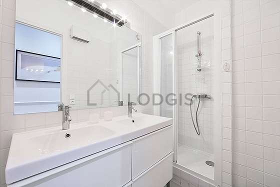 Este apartamento é equipado de uma casa de banho agradável é clara. Esta sala de água dispõe do necessário pelo seu bem estar na sua vida quotidiana : toalhas de banho, armário, ducheiro separado. Os WC são separados da casa de banho e situados em uma peça independente.
