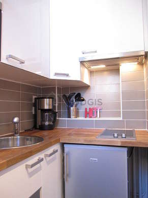Este apartamento tem uma bonita cozinha com azuleijo no piso e todo o equipamento pela sua vida quotidiana : fogaõ, micro-ondas combinado, freezer, exaustur, torradeira, máquina de café, armário, loiça, banco, bar.