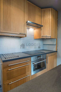 Este apartamento tem uma bonita cozinha perto do salaõ com azuleijo no piso e todo o equipamento pela sua vida quotidiana : fogaõ, frigorífico, micro-ondas combinado, freezer, exaustur, torradeira, chaleira, máquina de café, prateleira, armário, loiça, bar.