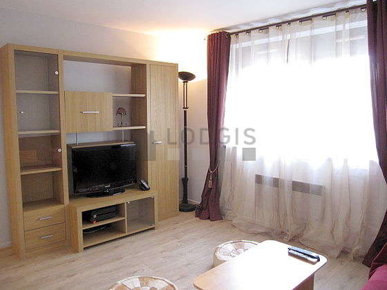 Este apartamento é composto de um agradável salão com parqué no piso é janelas vitros duplos é vista sobre jardim. Este salão calmo mobiliado et equipado para uma agradável estância : televisaõ, sofá, mesinha, prateleira.