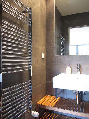 Este apartamento é equipado de uma casa de banho agradável. Esta sala de água dispõe do necessário pelo seu bem estar na sua vida quotidiana : toalhas de banho, prateleira, ducheiro separado, radiator secador de toalhas. Os WC são separados da casa de banho e situados em uma peça independente.