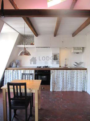 Este apartamento tem uma bonita cozinha perto do salaõ com piso de ceramica no piso e todo o equipamento pela sua vida quotidiana : fogaõ, frigorífico, forno, freezer, exaustur, chaleira, máquina de café, mesa de jantar, armário, loiça, 2 cadeira(s).