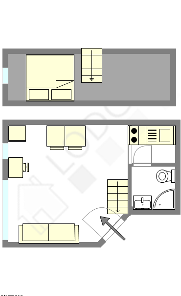 Graças a sua altura de teto, um bonita mezanino foi possível de ser instalado em este apartamento , oferecendo-lhe uma verdadeira peça suplementar equipada de lençois, colchas, comoda.