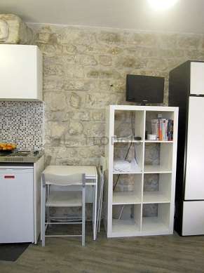Este apartamento tem uma cozinha perto do salaõ com parqué no piso e todo o equipamento pela sua vida quotidiana : fogaõ, frigorífico, freezer, torradeira, chaleira, máquina de café, armário, loiça.