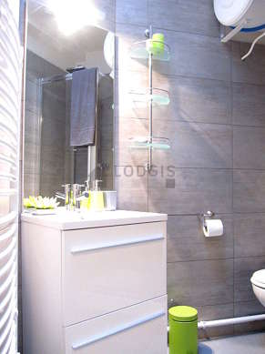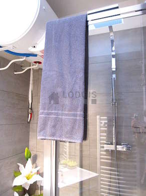 Este apartamento é equipado de uma casa de banho agradável é clara. Esta sala de água dispõe do necessário pelo seu bem estar na sua vida quotidiana : toalhas de banho, prateleira, armário, ducheiro separado, secador, sanibroyer, radiator secador de toalhas. Os WC são integrados na casa de banho.