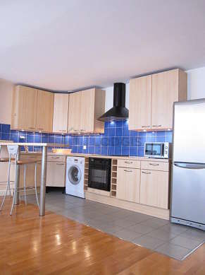 Este apartamento tem uma bonita cozinha com azuleijo no piso e todo o equipamento pela sua vida quotidiana : fogaõ, frigorífico, congelador, forno, microondas, exaustur, torradeira, chaleira, máquina de café, armário, loiça, bar.