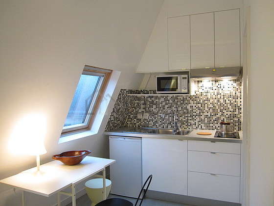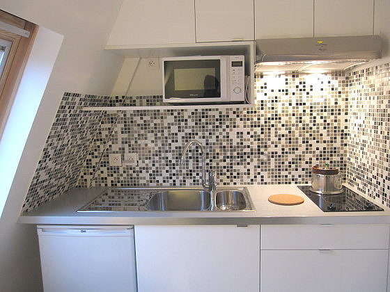 Este apartamento tem uma bonita cozinha com betão no piso e todo o equipamento pela sua vida quotidiana : fogaõ, frigorífico, microondas, exaustur, máquina de café, armário, loiça.
