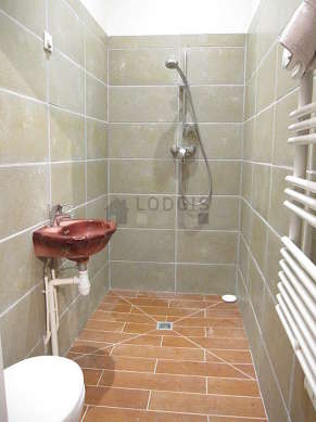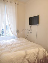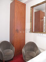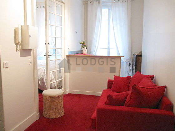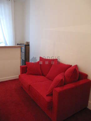 Este apartamento é composto de um charmoso salão com alcatifa no piso é janelas vitros duplos é vista sobre rua. Este salão calmo mobiliado et equipado para uma agradável estância : sofá, prateleira.