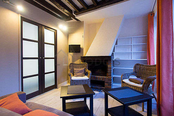 Este apartamento é composto de um agradável salão com linoleo no piso é janelas vitros duplos é vista sobre rua. Este salão calmo mobiliado et equipado para uma agradável estância : televisaõ, lençois, colchas, 2 poltrona(s), mesa de jantar, mesinha, prateleira, armário, 2 cadeira(s), banco1 sofá-cama.