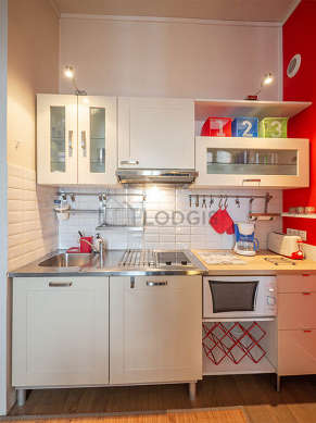 Este apartamento tem uma bonita cozinha com parqué no piso e todo o equipamento pela sua vida quotidiana : fogaõ, frigorífico, congelador, forno, micro-ondas combinado, exaustur, torradeira, máquina de café, mesa de jantar, armário, loiça, 1 cadeira(s).