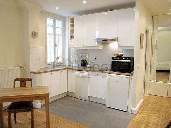 Este apartamento tem uma bonita cozinha com azuleijo no piso e todo o equipamento pela sua vida quotidiana : fogaõ, frigorífico, micro-ondas combinado, freezer, exaustur, chaleira, armário, loiça.