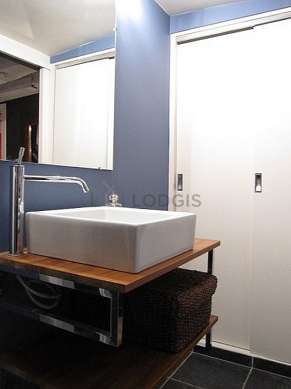 Este apartamento é equipado de uma casa de banho agradável. Esta sala de água dispõe do necessário pelo seu bem estar na sua vida quotidiana : toalhas de banho, prateleira, armário, ducheiro separado, secador, radiator secador de toalhas. Os WC são separados da casa de banho e situados em uma peça independente.