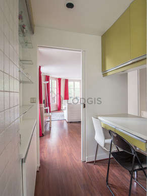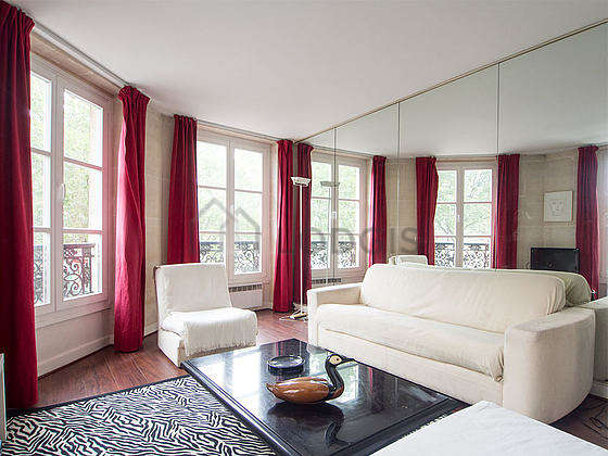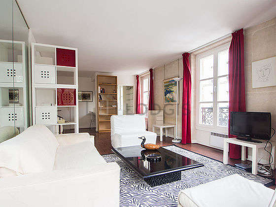 Este apartamento é composto de um atraente salão com parqué no piso é janelas é vista sobre rua. Este salão calmo mobiliado et equipado para uma agradável estância : televisaõ, 1 poltrona(s), mesinha, roupeiro, comoda, armário1 sofá-cama.