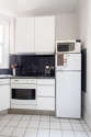 Este apartamento tem uma bonita cozinha com azuleijo no piso e todo o equipamento pela sua vida quotidiana : fogaõ, frigorífico, congelador, forno, microondas, torradeira, chaleira, máquina de café, prateleira, armário, loiça.