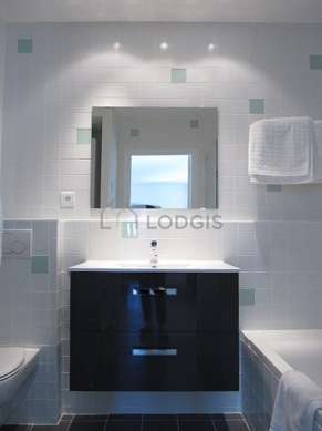 Este apartamento é equipado de uma casa de banho magnífico é clara with janelas. Esta sala de água dispõe do necessário pelo seu bem estar na sua vida quotidiana : toalhas de banho, prateleira, armário, banheira, secador, radiator secador de toalhas. Os WC são integrados na casa de banho.
