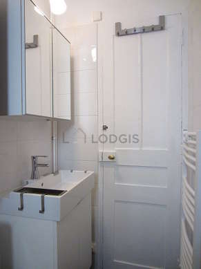 Este apartamento é equipado de uma casa de banho agradável with janelas. Esta sala de água dispõe do necessário pelo seu bem estar na sua vida quotidiana : toalhas de banho, prateleira, armário, ducheiro separado, radiator secador de toalhas. Os WC são integrados na casa de banho.