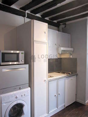 Este apartamento tem uma cozinha com parqué no piso e todo o equipamento pela sua vida quotidiana : fogaõ, frigorífico, forno, micro-ondas combinado, freezer, exaustur, torradeira, chaleira, máquina de café, armário, loiça.