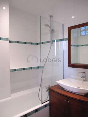 Este apartamento é equipado de uma casa de banho agradável é clara. Esta sala de água dispõe do necessário pelo seu bem estar na sua vida quotidiana : toalhas de banho, armário, banheira, secador, radiator secador de toalhas. Os WC são separados da casa de banho e situados em uma peça independente.