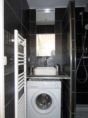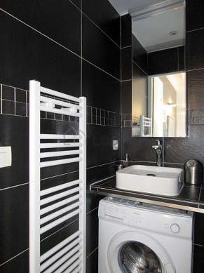 Este apartamento é equipado de uma casa de banho agradável. Esta sala de água dispõe do necessário pelo seu bem estar na sua vida quotidiana : toalhas de banho, prateleira, ducheiro separado, secador, radiator secador de toalhas. Os WC são separados da casa de banho e situados em uma peça independente.