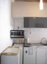 Este apartamento tem uma cozinha com azuleijo no piso e todo o equipamento pela sua vida quotidiana : fogaõ, frigorífico, micro-ondas combinado, freezer, chaleira, máquina de café, mesa de jantar, armário, loiça, bar.