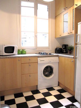 Este apartamento tem uma bonita cozinha e todo o equipamento pela sua vida quotidiana : fogaõ, frigorífico, congelador, microondas, torradeira, máquina de café, armário, loiça.