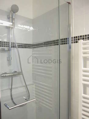 Este apartamento é equipado de uma casa de banho agradável é clara. Esta sala de água dispõe do necessário pelo seu bem estar na sua vida quotidiana : toalhas de banho, armário, ducheiro separado, radiator secador de toalhas. Os WC são separados da casa de banho e situados em uma peça independente.