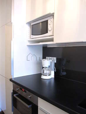 Este apartamento tem uma bonita cozinha com parqué no piso e todo o equipamento pela sua vida quotidiana : fogaõ, frigorífico, congelador, microondas, exaustur, máquina de café, loiça.