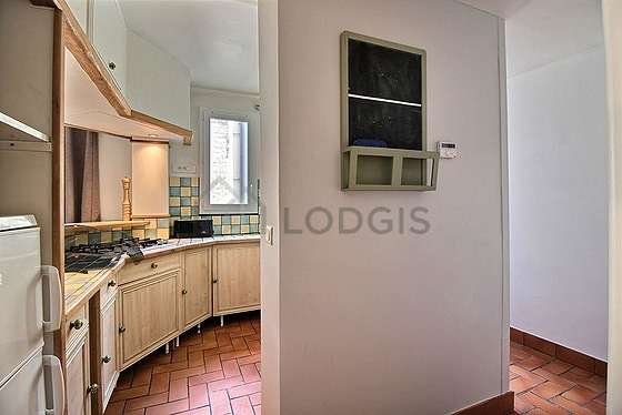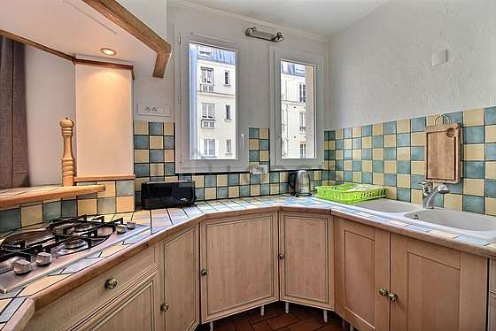 Este apartamento tem uma bonita cozinha com azuleijo no piso e todo o equipamento pela sua vida quotidiana : frigorífico, congelador, microondas, torradeira, chaleira, máquina de café, loiça.