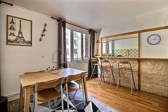 SalaõEste apartamento é composto de um agradável salão com parqué no piso é janelas é vista sobre pátio. Este salão very quiet mobiliado et equipado para uma agradável estância : televisaõ, sofá, 1 poltrona(s), mesa de jantar, mesinha, secretária, prateleira, 5 cadeira(s), banco.