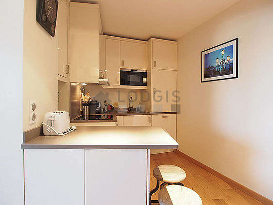 Este apartamento tem uma bonita cozinha com parqué no piso e todo o equipamento pela sua vida quotidiana : fogaõ, frigorífico, microondas, freezer, exaustur, torradeira, chaleira, máquina de café, armário, loiça, banco, bar.