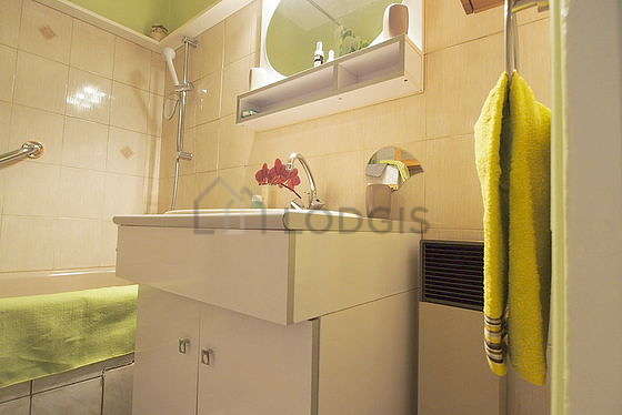 Este apartamento é equipado de uma casa de banho agradável. Esta sala de água dispõe do necessário pelo seu bem estar na sua vida quotidiana : toalhas de banho, armário, banheira. Os WC são separados da casa de banho e situados em uma peça independente.