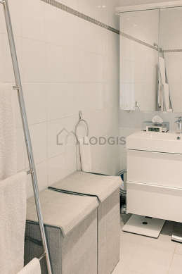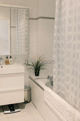 Este apartamento é equipado de uma casa de banho agradável. Esta sala de água dispõe do necessário pelo seu bem estar na sua vida quotidiana : toalhas de banho, armário, banheira, secador. Os WC são separados da casa de banho e situados em uma peça independente.