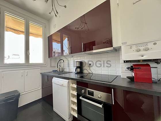 Este apartamento tem uma magnífico cozinha com azuleijo no piso e todo o equipamento pela sua vida quotidiana : fogaõ, frigorífico, congelador, forno, exaustur, torradeira, chaleira, máquina de café, prateleira, armário, loiça.