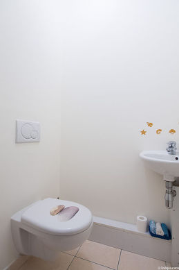 Este apartamento é equipado de uma casa de banho magnífico é clara. Esta sala de água dispõe do necessário pelo seu bem estar na sua vida quotidiana : toalhas de banho, armário, ducheiro separado, secador, radiator secador de toalhas. Os WC são separados da casa de banho e situados em uma peça independente.