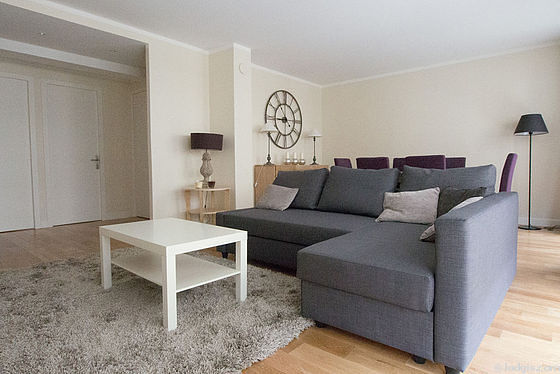 Este apartamento é composto de um agradável salão com parqué no piso é janelas vitros duplos é vista sobre rua. Este salão calmo mobiliado et equipado para uma agradável estância : televisaõ, sofá, mesa de jantar, mesinha, bufet, 6 cadeira(s).