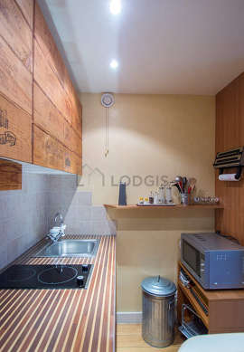 Este apartamento tem uma magnífico cozinha com parqué no piso e todo o equipamento pela sua vida quotidiana : fogaõ, frigorífico, microondas, freezer, chaleira, máquina de café, prateleira, armário, loiça, banco, bar.