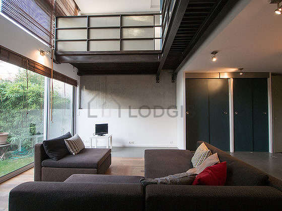 Este dúplex é composto de um atraente salão com betão no piso é janelas vitros duplos é vista sobre jardim. Este salão calmo mobiliado et equipado para uma agradável estância : televisaõ, sofá, mesinha, roupeiro, prateleira, armário.