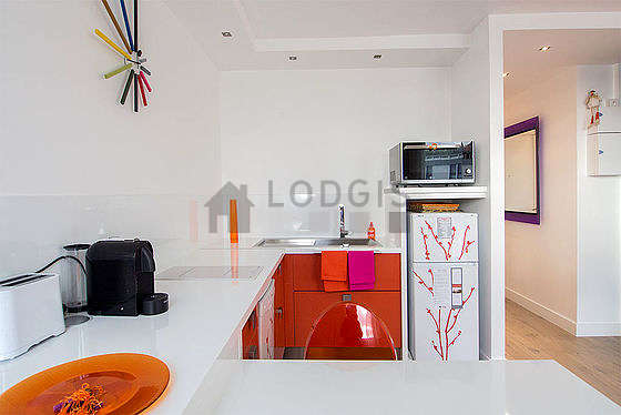 Este apartamento tem uma magnífico cozinha com parqué no piso e todo o equipamento pela sua vida quotidiana : fogaõ, frigorífico, congelador, micro-ondas combinado, torradeira, chaleira, máquina de café, mesa de jantar, prateleira, armário, loiça.