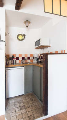 Este apartamento tem uma bonita cozinha com azuleijo no piso e todo o equipamento pela sua vida quotidiana : fogaõ, frigorífico, microondas, máquina de café, prateleira, armário, loiça, plates, casserole dish, cutlery, work surface, stove, bin, coffee cups, water glass.