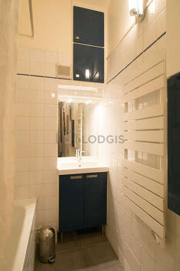 Este apartamento é equipado de uma casa de banho. Esta sala de água dispõe do necessário pelo seu bem estar na sua vida quotidiana : toalhas de banho, armário, banheira, radiator secador de toalhas. Os WC são separados da casa de banho e situados em uma peça independente.