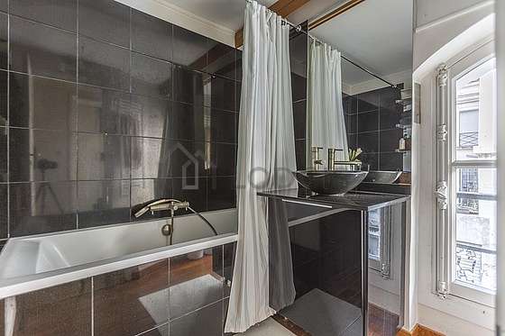Este apartamento é equipado de uma casa de banho agradável. Esta sala de água dispõe do necessário pelo seu bem estar na sua vida quotidiana : toalhas de banho, prateleira, banheira, secador, radiator secador de toalhas. Os WC são separados da casa de banho e situados em uma peça independente.