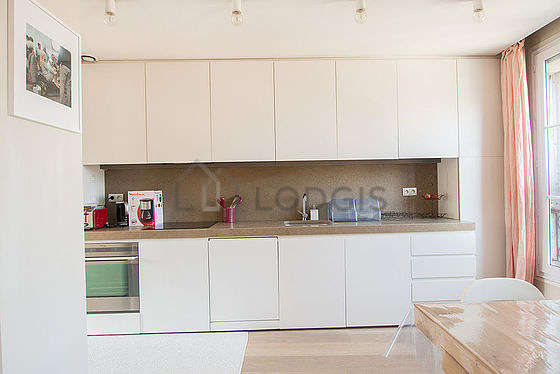 Este apartamento tem uma magnífico cozinha com parqué no piso e todo o equipamento pela sua vida quotidiana : fogaõ, frigorífico, congelador, forno, torradeira, chaleira, máquina de café, armário, loiça.