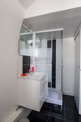 Este apartamento é equipado de uma casa de banho agradável é clara with janelas vitros duplos. Esta sala de água dispõe do necessário pelo seu bem estar na sua vida quotidiana : toalhas de banho, ducheiro separado, secador, radiator secador de toalhas. Os WC são integrados na casa de banho.