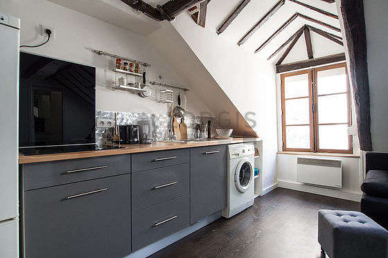 Este apartamento tem uma bonita cozinha com parqué no piso e todo o equipamento pela sua vida quotidiana : fogaõ, frigorífico, congelador, microondas, torradeira, chaleira, máquina de café, armário, loiça.