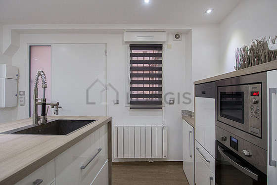 Este apartamento tem uma bonita cozinha com azuleijo no piso e todo o equipamento pela sua vida quotidiana : fogaõ, frigorífico, congelador, forno, microondas, exaustur, torradeira, chaleira, máquina de café, prateleira, armário, loiça, banco, bar.
