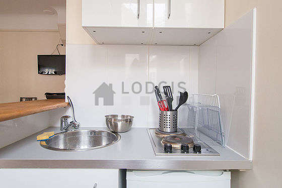 Este apartamento tem uma bonita cozinha com azuleijo no piso e todo o equipamento pela sua vida quotidiana : fogaõ, frigorífico, micro-ondas combinado, torradeira, máquina de café, armário, loiça, banco, bar.
