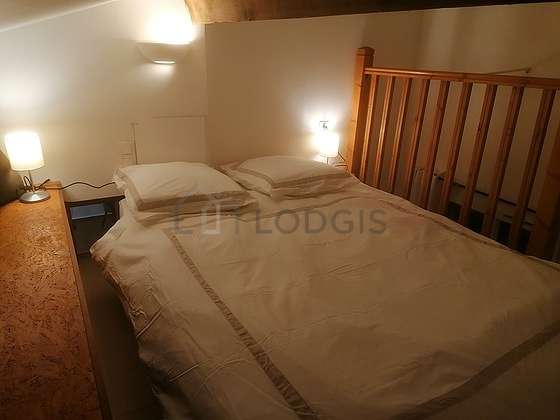 Graças a sua altura de teto, um bonita mezanino foi possível de ser instalado em este apartamento , oferecendo-lhe uma verdadeira peça suplementar equipada de lençois, colchas, mesinha de cabeceira.