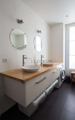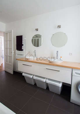Este apartamento é equipado de uma casa de banho magnífico é clara with janelas vitros duplos. Esta sala de água dispõe do necessário pelo seu bem estar na sua vida quotidiana : toalhas de banho, armário, banheira, ducheiro separado, radiator secador de toalhas. Os WC são separados da casa de banho e situados em uma peça independente.