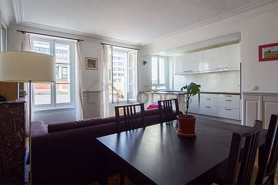 Este apartamento é composto de um bonito salão com parqué no piso é janelas é vista sobre pátio. Este salão calmo mobiliado et equipado para uma agradável estância : mesa de jantar, biblioteca, prateleira, 4 cadeira(s)1 sofá-cama.