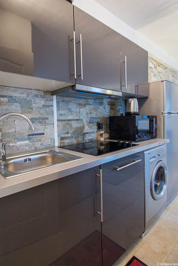 Este apartamento tem uma magnífico cozinha com azuleijo no piso e todo o equipamento pela sua vida quotidiana : fogaõ, frigorífico, congelador, microondas, exaustur, chaleira, armário, loiça.